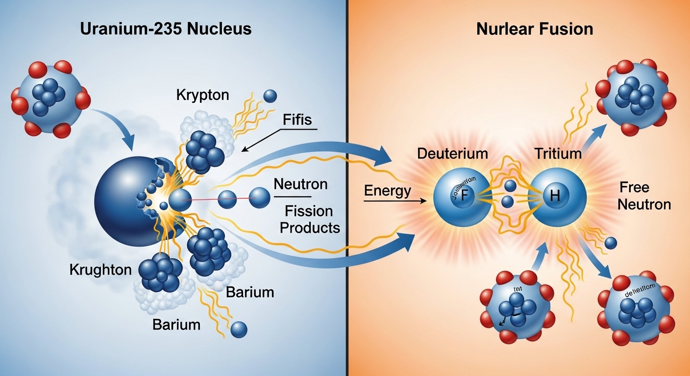 핵분열은 무거운 원자핵(우라늄, 플루토늄)이 중성자와 충돌하여 쪼개지는 반응인 반면, 핵융합은 가벼운 원자핵(중수소, 삼중수소)이 초고온 상태에서 융합하여 더 무거운 원자핵을 형성하는 반응입니다. 핵분열은 제어된 연쇄 반응을 기반으로 하며, 핵융합은 강력한 자기장으로 초고온 플라즈마를 가두어 반응을 유도합니다.